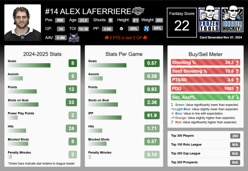 For the season over 14 games, Laferriere has netted eight goals and collected five assists, good for 13 points total. The Kings third-line winger has also been a nice source of shots (24.2% S%) and hits (24) for managers who roster him in banger leagues (i.e., leagues that count hits and blocks).