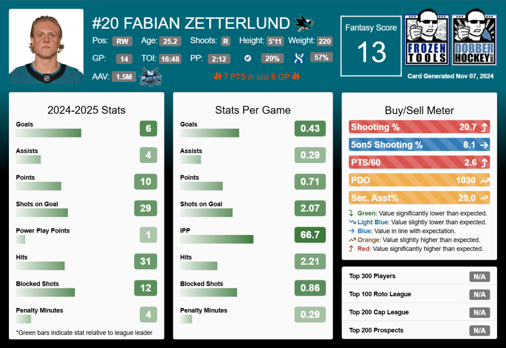 Fantasy hockey managers should notice a trend: when Zetterlund puts up points recently, the Sharks win.