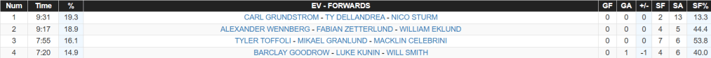 Based on those shot numbers, the gap could shrink a bit between the two Swedish wingers, but I still see Zetterlund as the primary shot maker and point-creator (0.71 PTS/G) for the San Jose second line, even with Eklund recently joining.