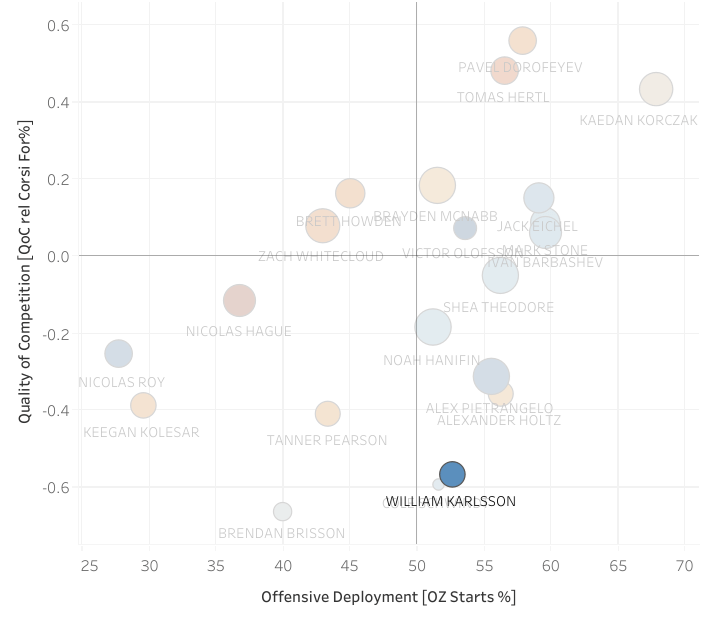 The PTS/60 and PDO suggest that Karlsson is on a serious heater, but could be due for some regression once he gets a few more games under his belt. His 2.44 GF/G is lower than the four goals he has scored this year, and his quality of competition on the Vegas player deployment chart is even more concerning than Laferriere’s.