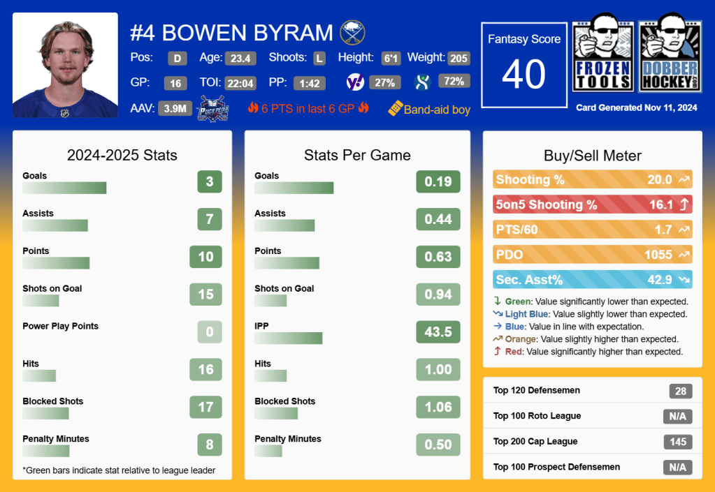 The 23-year-old Canadian defenseman has 10 points on three goals and seven assists in 16 games played this season. His PTS/G has jumped from 0.40 last year to 0.63 this season and his SH% has also improved from 13.1% to 20% as well. In his last four games, Byram has four points, including two goals and two assists.
