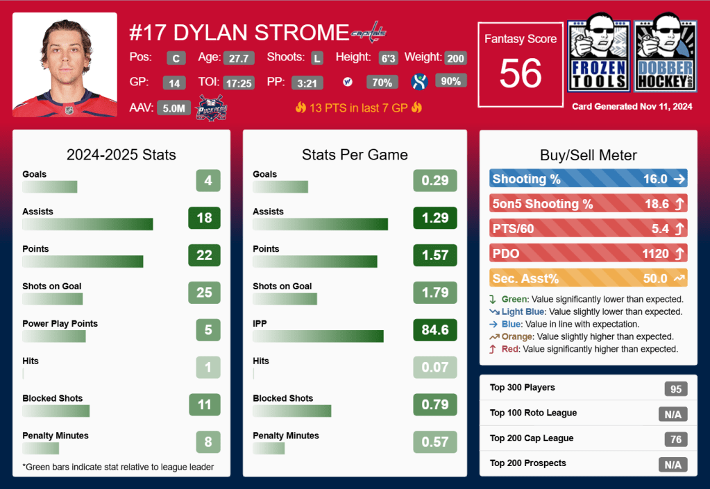 Ovi is the main point-accumulator on the Capitals first line, as he has eight goals and five assists in his last seven games. While Strome is certainly setting Ovechkin up for goals with plenty of apples, Strome is not producing many shots.