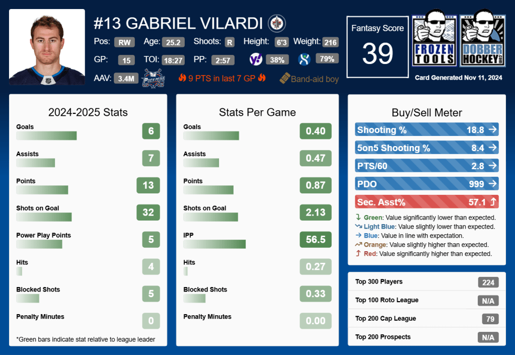 In his last 10 games, Vilardi has emerged as a key shot taker and goal scorer for the Jets’ first line. He has six goals and four assists over that time frame, and he also has a 22.2% SH% and 27 SOG in that sample as well.