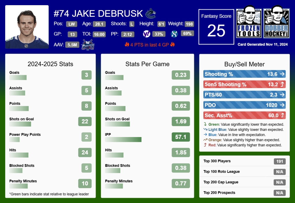 In 13 games played with Vancouver, he only has eight points on three goals and five assists. His Pts/60 is also 2.3 and his SOG/G is 1.7, down 0.6 points from a season ago.