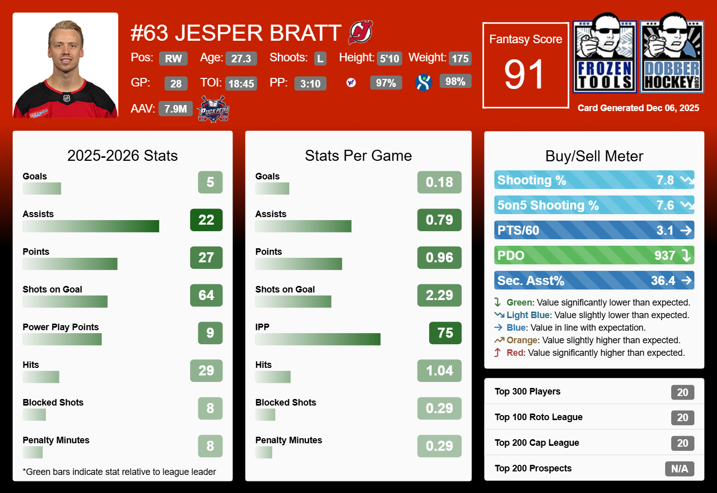Bratt is on a bit of a cold streak, with zero points in his last two games. Before that, he had back-to-back two-point efforts against Buffalo and Philadelphia on November 28th and 29th. His production has been a little lower than expected, a product of his 7.8% shooting percentage. However, I like them against the Bruins and goalie Jeremy Swayman, who has 3.86 GAA and .857 save percentage in his last three games.