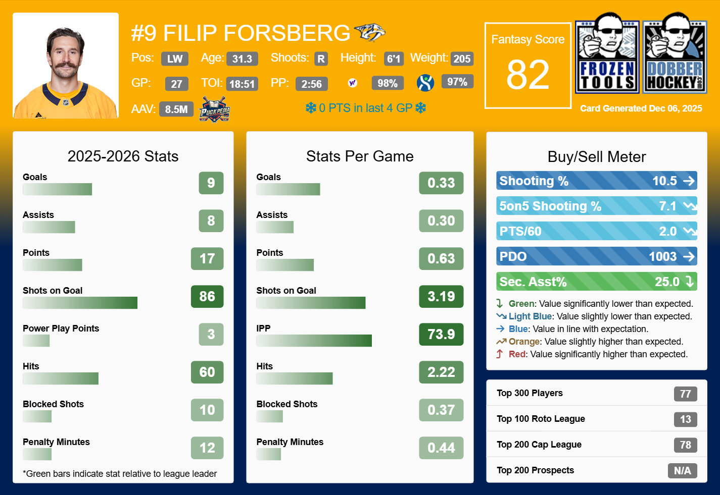 Nashville will be a massive underdog against Carolina (Hurricanes are -1.5 goal favorites), and Forsberg is on a cold streak, with zero points in the last four games. That said, he still is averaging over three shots a game with a shooting percentage over 10 percent.