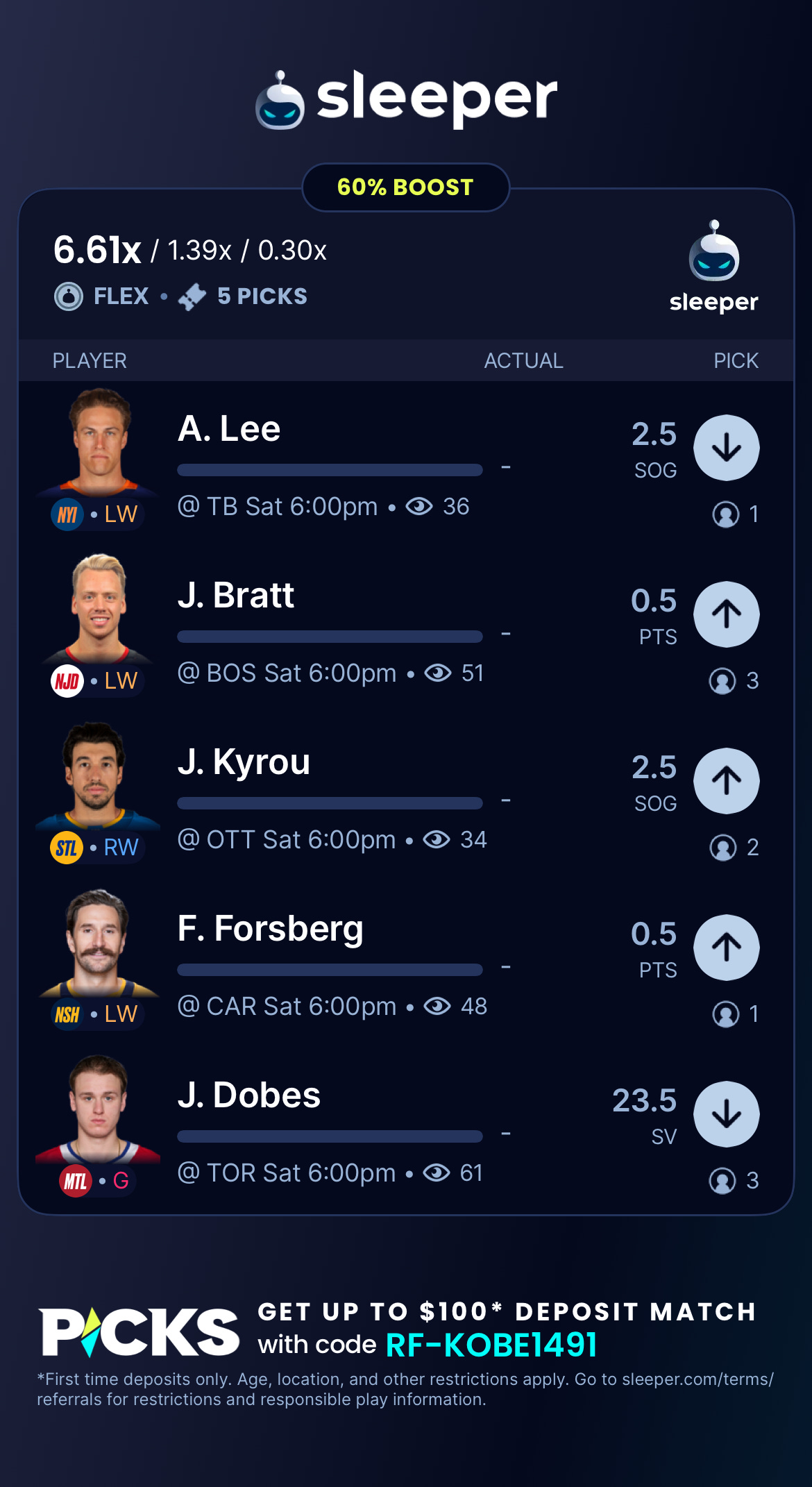 Sleeper has a 60% on NHL picks with five or more selections, which explains why I have five this week instead of the typical three or four. I did make “flex” picks, which gives me some grace if I miss one pick (I would still make money, but the max payout is a little lower).