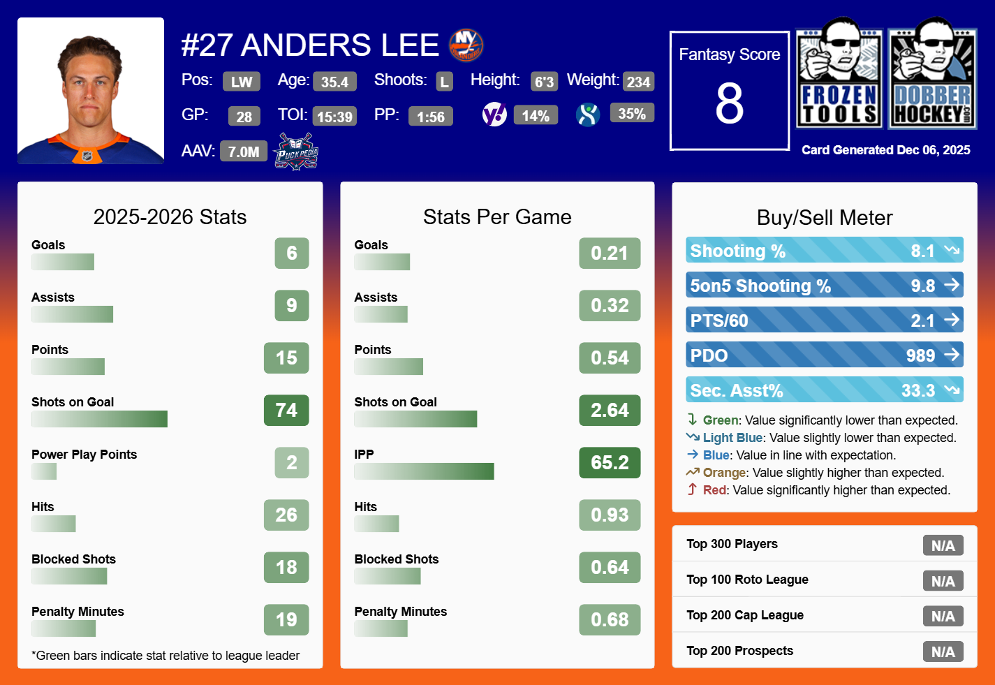 In their last game against the Lightning on December 2nd in Long Island, the Islanders beat the Lightning 2-1. However, Lee was shut out in terms of points and SOG. Anders is averaging 2.64 SOG/G this year, but I have a hard time seeing him hit that mark after getting shutout by the Tampa Bay blue line just four days ago, especially with the rematch in Tampa.