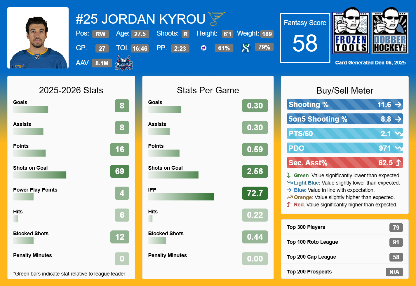 A promising trend for the Blues is that Ottawa goalie Linus Ullmark, who’s the projected starter, has been a mess recently. He is allowing a 4.02 GAA and an .830 save percentage in his last two starts. Expect the Blues and Kyro to benefit from Ottawa’s leaky defense and goaltending as of late.
