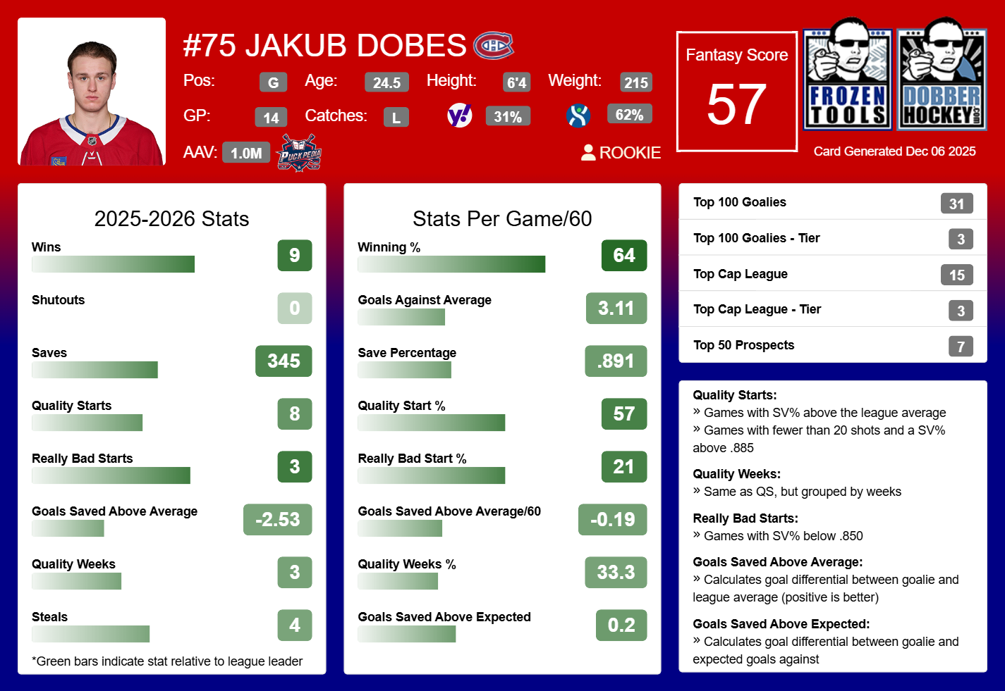 My last Sleeper pick is Dobes, who’s producing a 3.11 GAA and .891 save percentage this year as the Canadiens’ backup goalie.