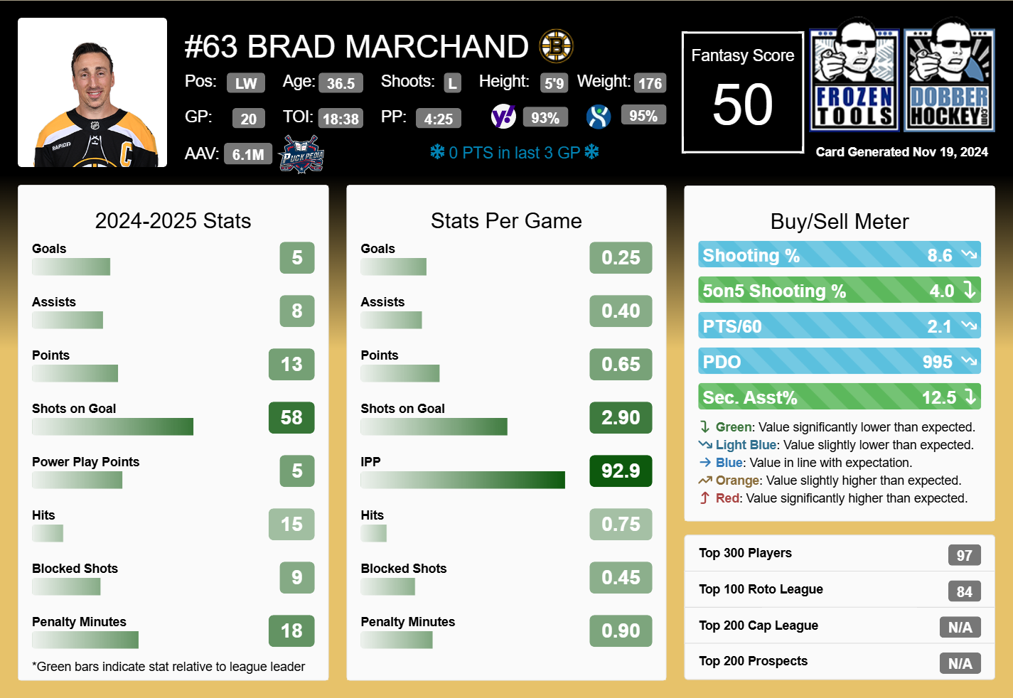 To make matters worse, the secondary assist% is only 12.5%, down from 44.7% last year. That is concerning as it shows that Marchand isn’t getting those secondary assists that can boost a fantasy team’s scoring. Thus, he’s not producing fantasy-wise in other ways when he's not scoring goals. Furthermore, he only has 15 hits and nine blocks, which are pretty pedestrian numbers in banger leagues and further shows his limited value when he’s not finding the puck into nets.