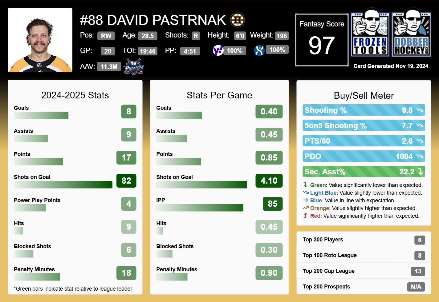 Interestingly enough, penalties have been an issue for Pastrnak in these first 20 games of the season. His PIM/GP is 0.90, the highest of his career, and nearly 0.33 higher than a year ago. That is a sign of frustration from Pastrnak, and it has seemed to get him out of his playmaking rhythm when he is on the ice, much to the chagrin of fantasy managers who roster him on their teams.