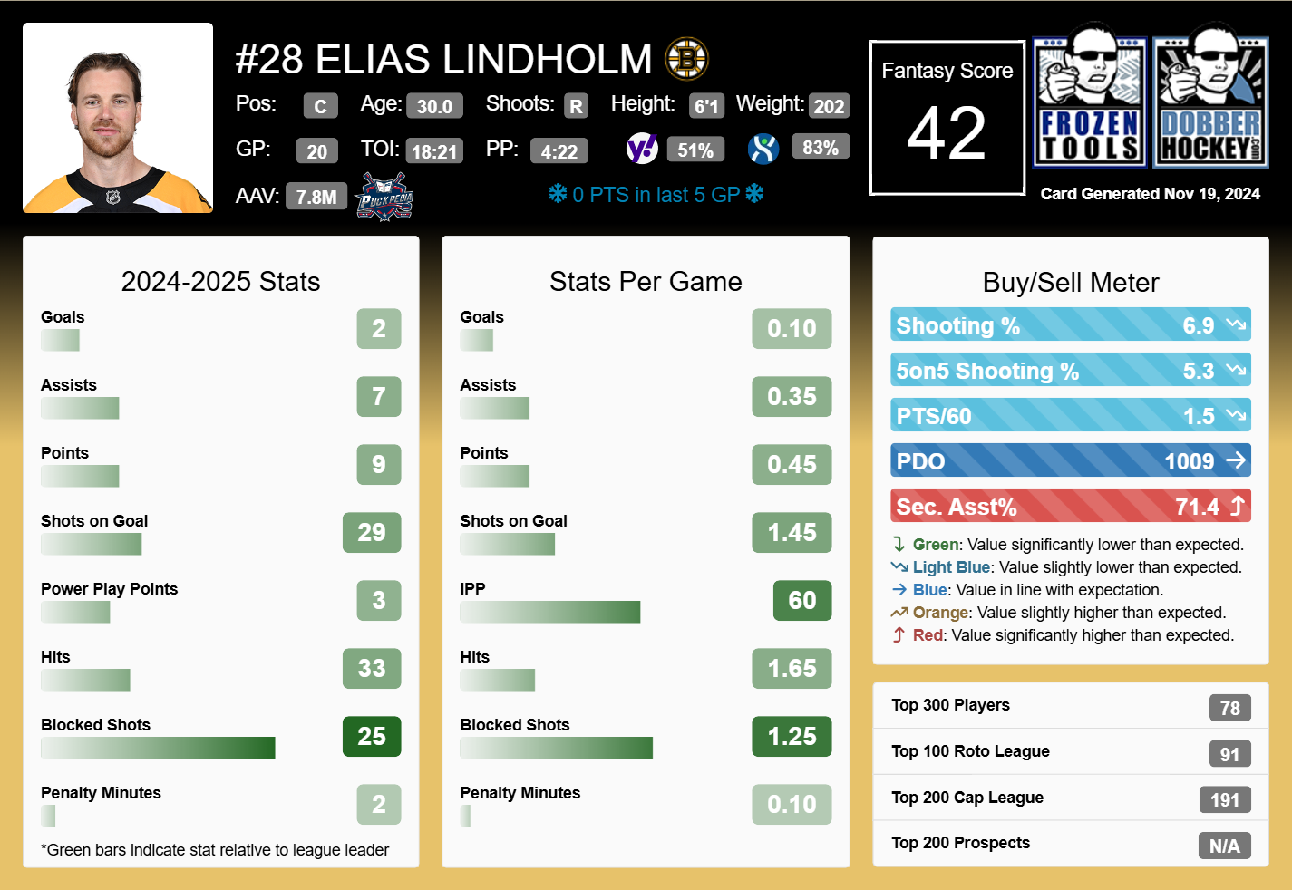 His secondary assist% is 71.4%, up from his 51.7% last year. He is also a block machine with the Bruins. He has 25 this year and averages 1.25 BLK/G. For fantasy managers who play in banger league formats, Lindholm could be an excellent source of assists and blocks, with the former perhaps surging in the coming weeks with a new voice leading the locker room.