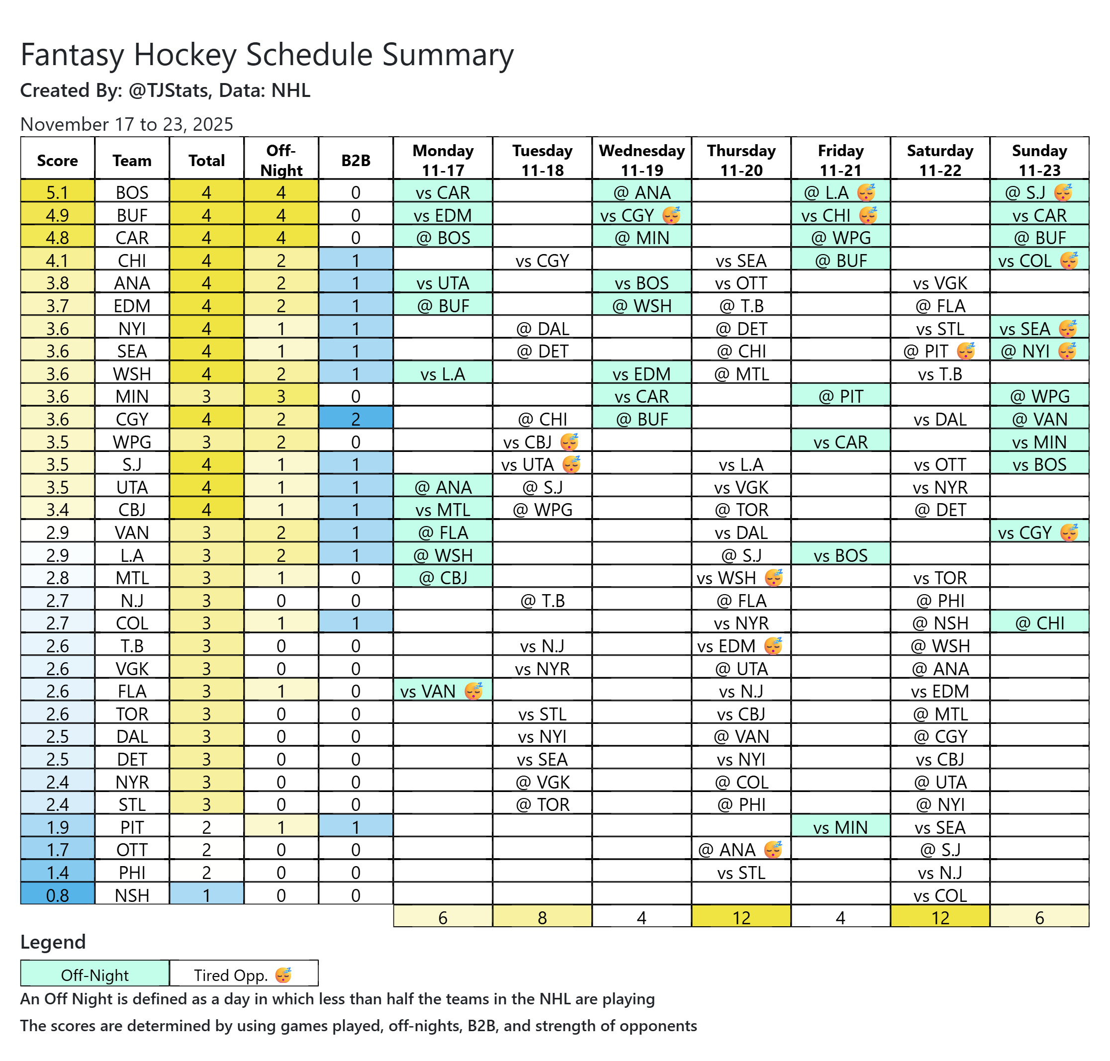Here’s how Week 7 looks schedule-wise via TJ Stats and his fantasy hockey schedule summary app.