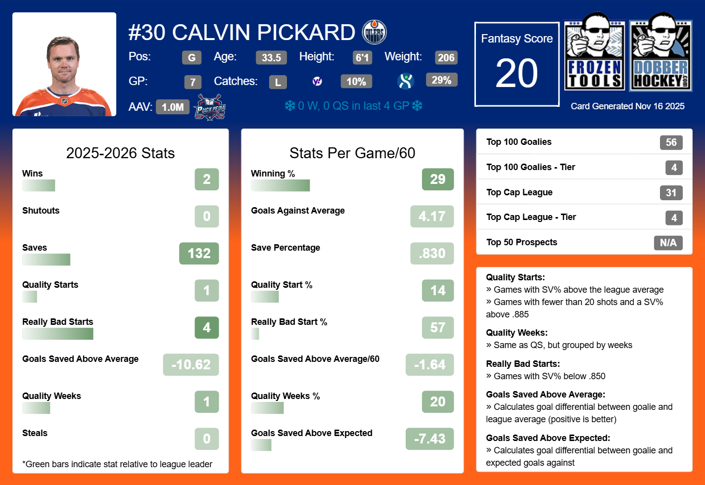 In seven starts, Pickard has only two wins and one quality start. His GAA is 4.17, his save percentage is 0.830, and his GSAA -10.62. All those are below-average marks and explains why his rostered percentage is low at 10 percent.