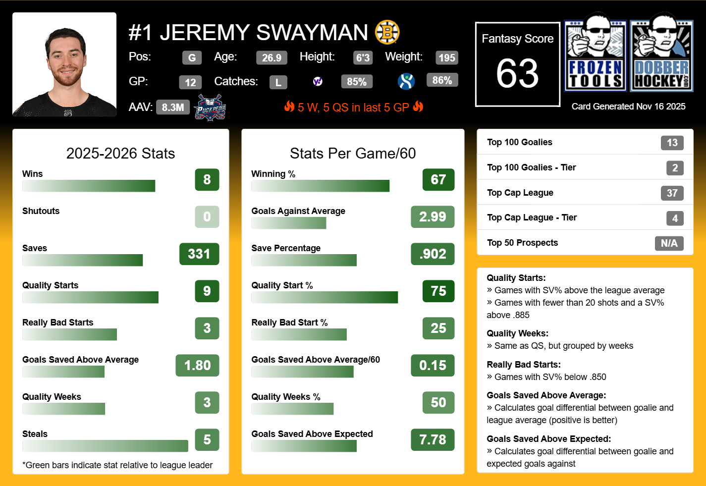 The Boston goaltender has been a brick wall for the Bruins, who sit in first place in the Atlantic Division with 24 points. Swayman has five wins and five quality starts in his last five games. Over that time span, he also has a 2.37 GAA, .923 save percentage, and 3.97 GSAA.
