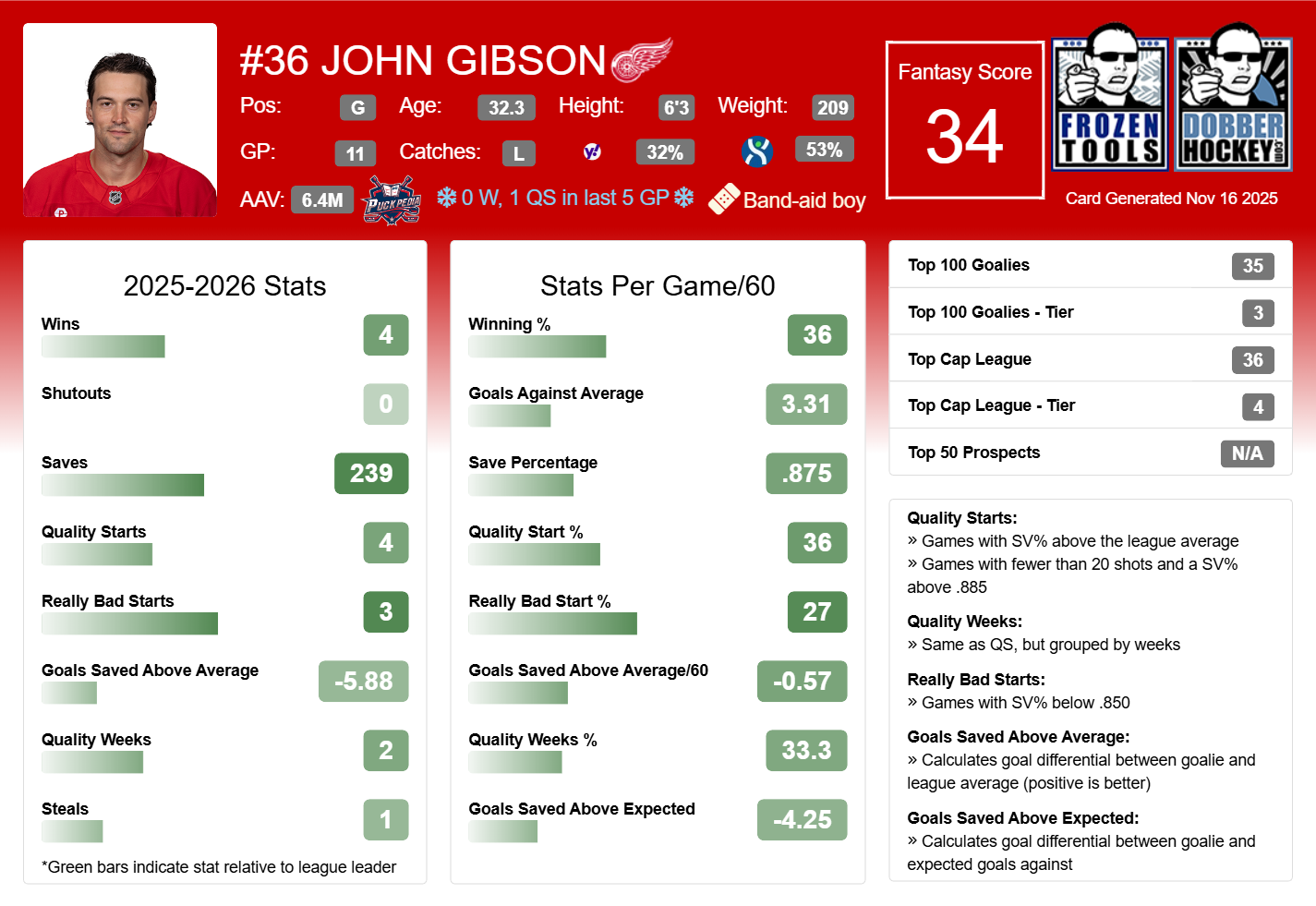 In 11 starts this year, Gibson only has four wins and a winning percentage of 36%. He sports a 3.31 GSAA and .875 save percentage with a -5.88 GSAA. His quality start% is medicore at 36% and his Really Bad Start percentage is close to that QS% at 27%. A nine percent difference between those two metrics isn’t an encouraging sign going forward for the former Anaheim goaltender.