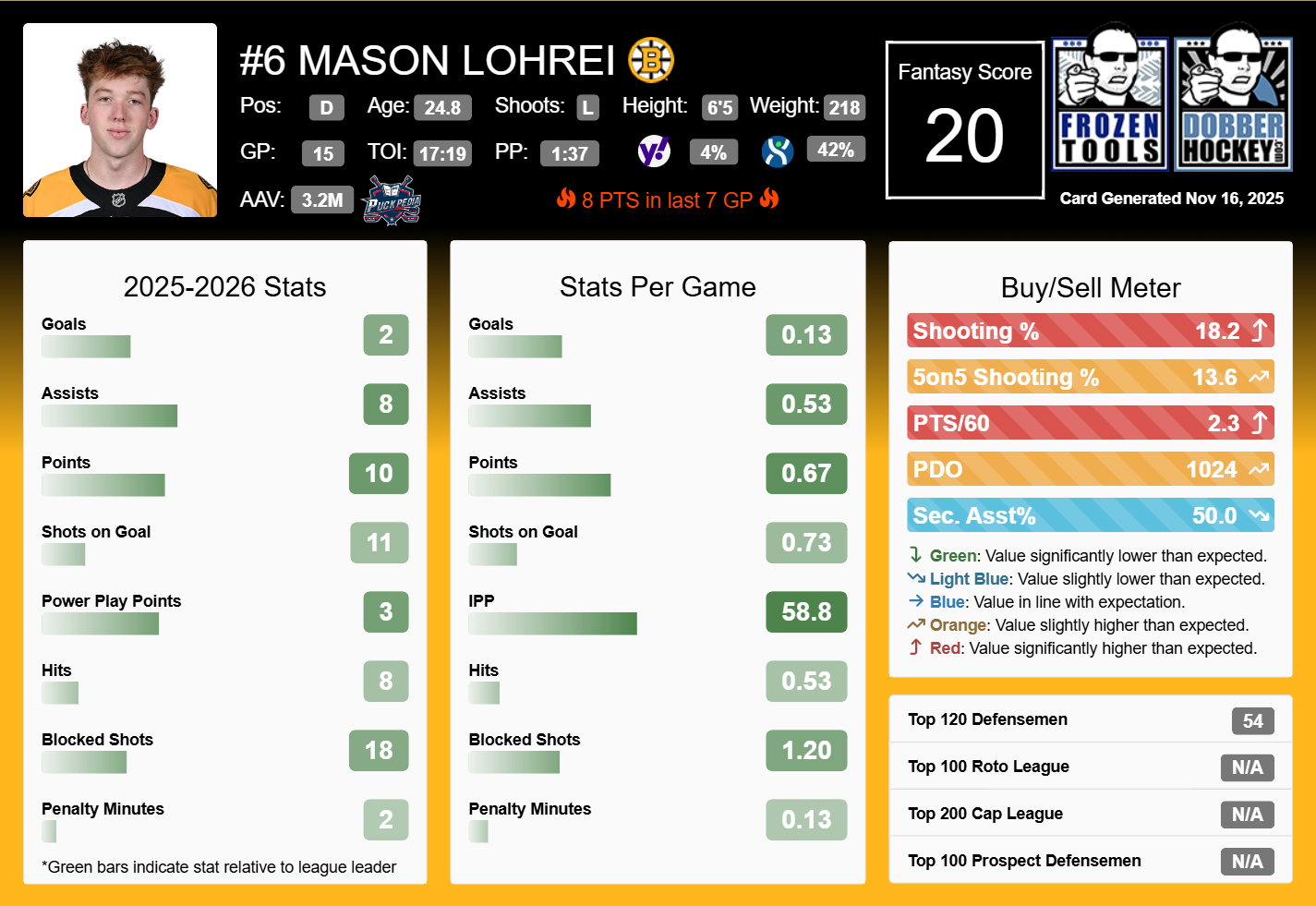 Lohrei doesn’t get in the box much, as he is only averaging 0.13 PIM. Thus, those in extreme banger leagues where PIM is a scoring category may want to look for other options. For the season, the 24-year-old American is averaging 17:19 TOI and 1:37 PP TOI, not bad for a defenseman who is available in 96% of Yahoo leagues, as of Sunday.