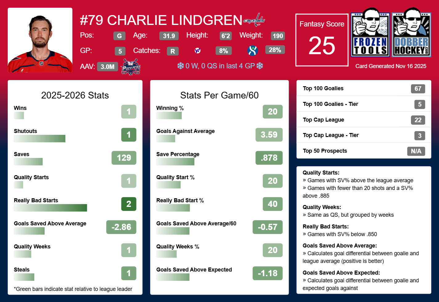 Lindgren hasn’t been terrible. That said, with Thompson so clearly entrenched as Washington’s main goalie, and the Capitals’ scoring struggles, he’s not even a great third goalie option. He won’t get many outings, the stats aren’t great, and it’s unlikely that he’ll steal any wins unless Washington’s attack turns it around soon.