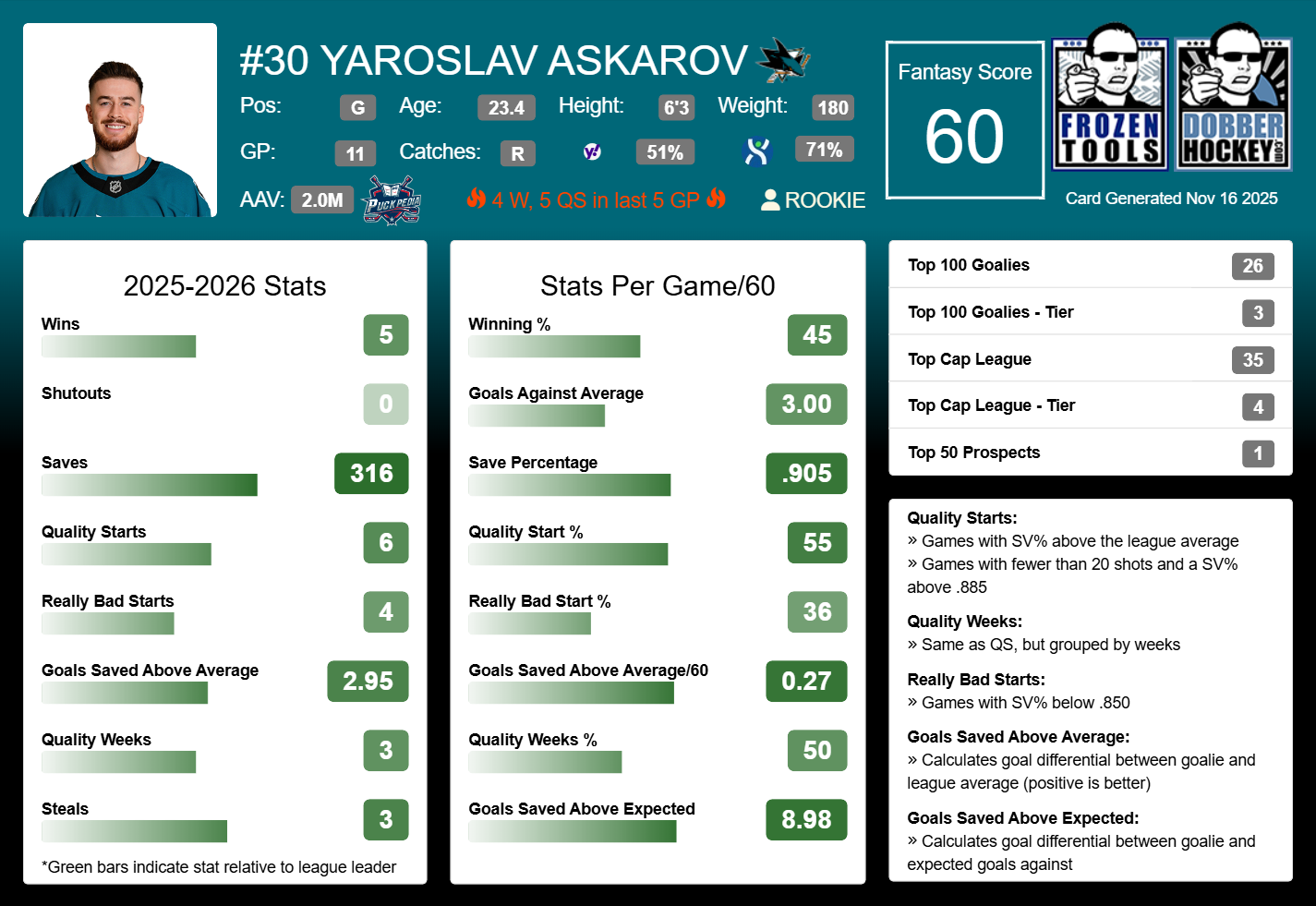 Stud: Yaroslav Askarov, SJS (51% Rostered)