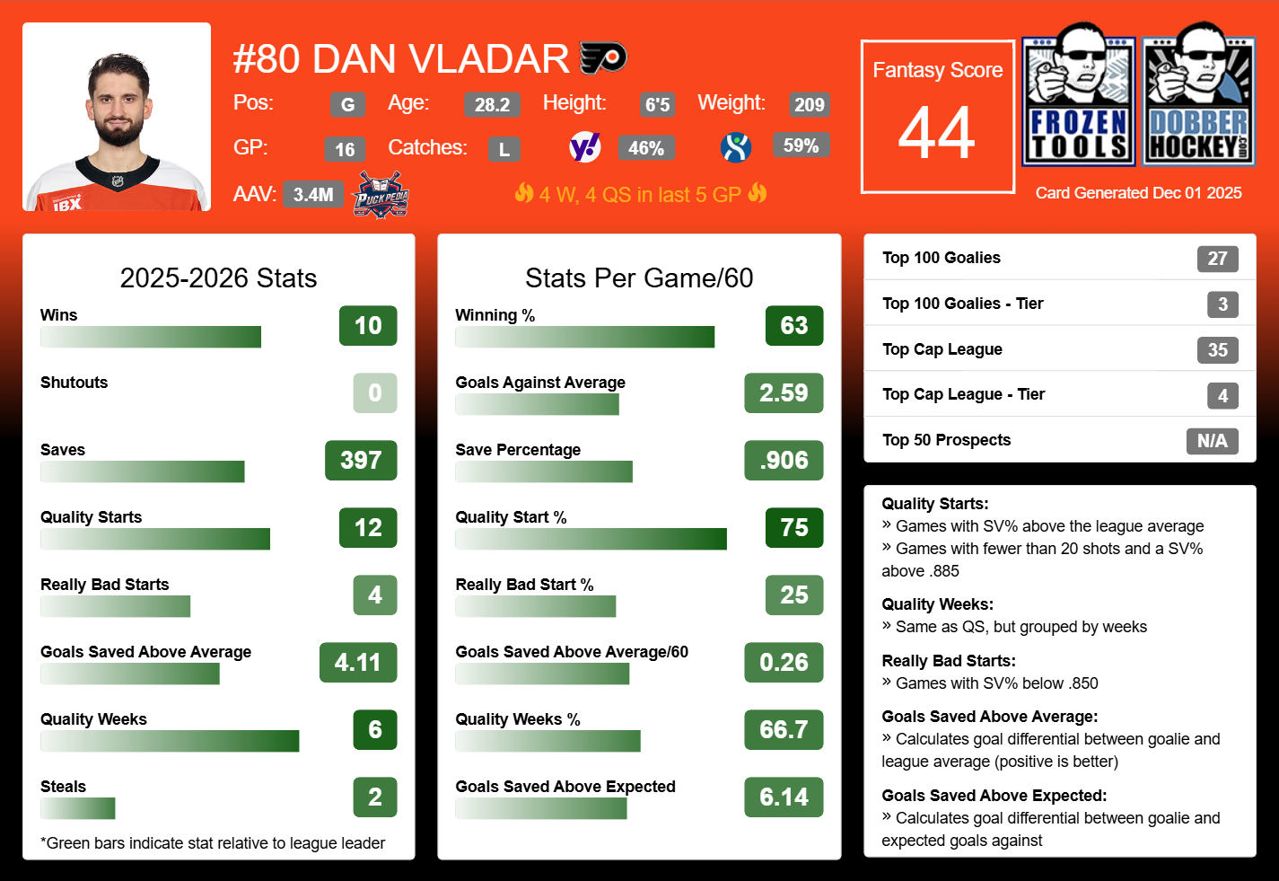 He’s been especially stellar recently, with three wins and five quality starts in his last five games played. Also, in the previous two weeks, he has sported a 1.99 GAA, a .926 save percentage, a 4.01 GSAA, an 8.05 GSAx, and has accumulated 31.8 FPTS in KKUPFL. His latter mark is better than Vladar, Washington’s Logan Thompson, Seattle’s Joey Daccord (23.4 FPTS), and St. Louis’ Jordan Binnington (23.1 FPTS), all primary goalies for their respective teams.