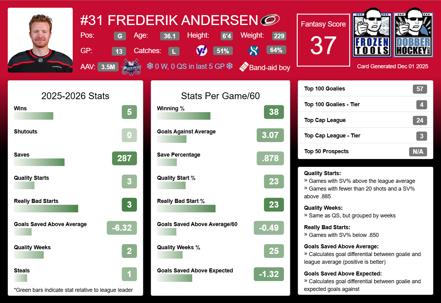Andersen leads the Hurricanes' goaltenders with 13 starts. However, that’s been more due to injury issues with Pyotr Kochetkov than Andersen’s play.