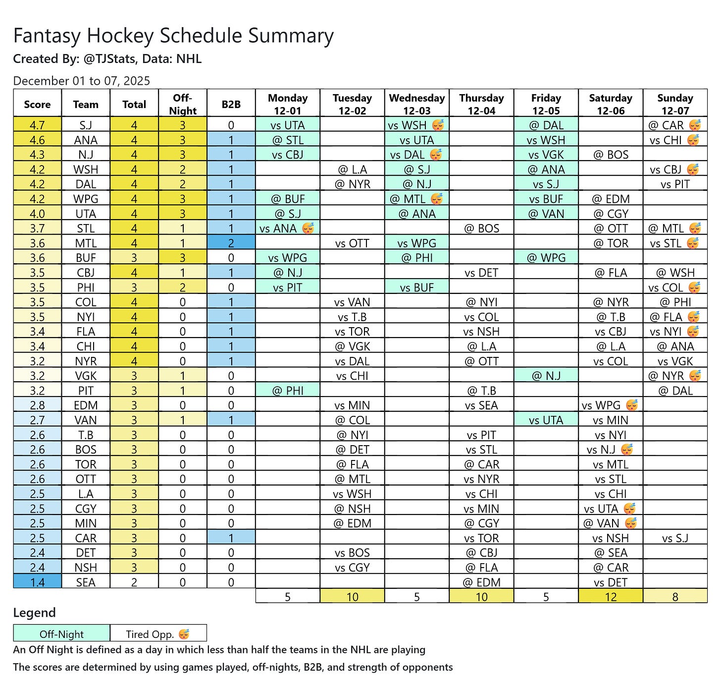 Per usual for these posts, I typically look at the streaming schedule via TJ Stats’ Fantasy Hockey schedule tool. Here’s what TJ’s team rankings look like for week nine.