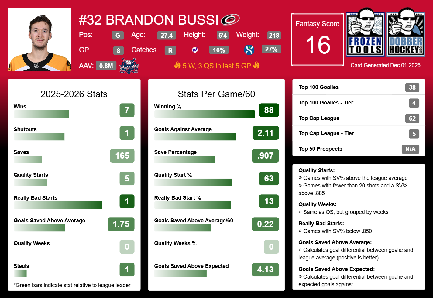 In eight starts, he has seven wins, a 63% quality start percentage, a 2.11 GAA, 1.75 GSAA, and a .907 save percentage. Over the past two weeks, he has five wins and three quality starts, with a 1.31 GAA, .927 save percentage, and 1.67 GSAA. The GSAA is a little low, but his 4.13 GSAx is a bit more encouraging and suggests Bussi may be in line for more quality starts down the road, especially after his first career shutout in his most recent start against Calgary.