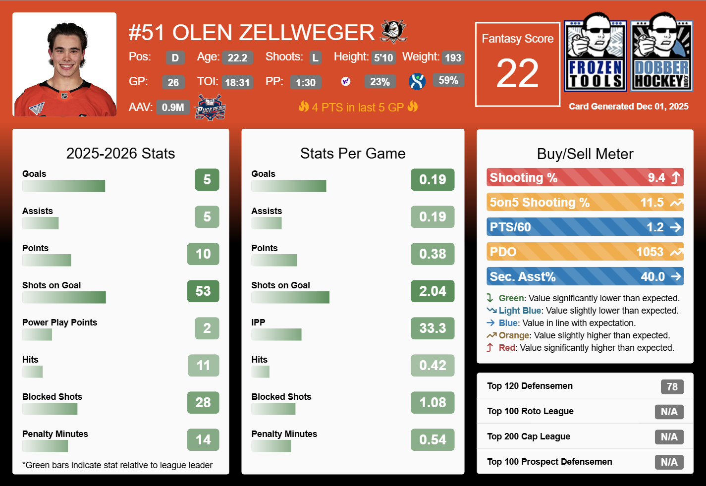 My streamer of the week is Olen Zellweger, a Ducks blue-liner who is rostered in 23% of Yahoo leagues.