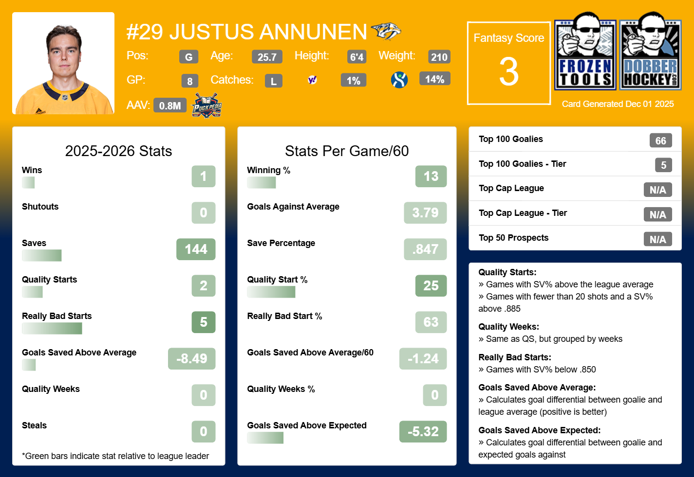 It hasn’t been pretty this year for Annunen, and even with star goalie Juuse Saaros going through a down year (7-9-3, 3.08 GAA, .888 save percentage), it doesn’t seem like Annunen is going to be getting more starts or fantasy production anytime soon.