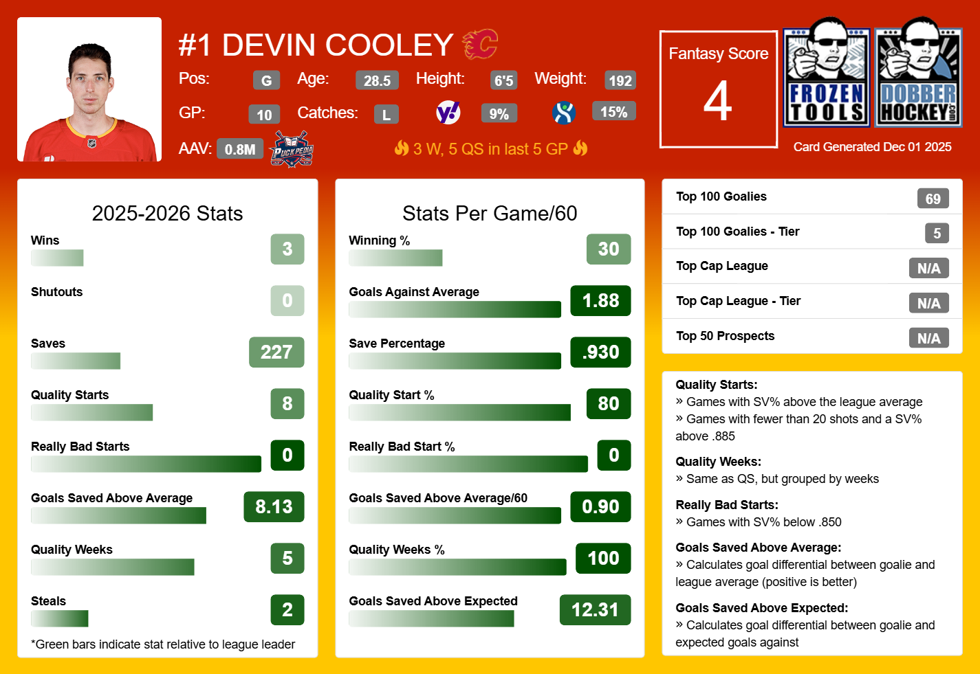 After spending all of 2024-2025 in the AHL, Cooley has gotten his shot to back up Dustin Wolf in Calgary, and the 28-year-old American has made the most of his opportunity this year. In 10 games, the Flames’ backup goalie has three wins, an 80% quality start percentage, a 1.88 GAA, a .930 save percentage, and a GSAA of 8.13.