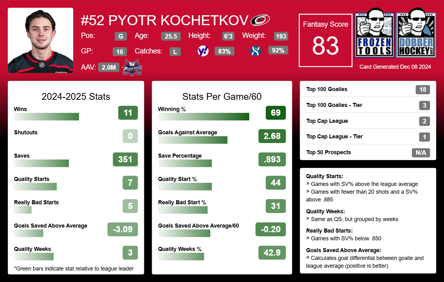 Kochetkov is the “primary” goaltender in Carolina by sheer elimination. Fellow Hurricanes goaltender Fredrik Anderson just had knee surgery on November 21st, and he will be out for 8-12 weeks. Spencer Martin has made nine appearances this year for Carolina but hasn’t been great, as he has only one quality start and is posting a 3.89 GAA and 0.846 SV%.