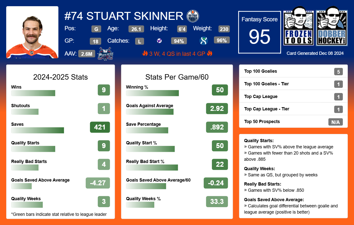 Skinner got off to a slow start this season, and his overall metrics showcase that. His GAA is decent at 2.92, and his quality start percentage is 50%. However, his GSAA is -4.27 for the year, and his SV% is only .892. For someone who was viewed as a Tier 1 goalie by Dobber in their Top 100 Goalie rankings in the preseason, fantasy managers expected more from the Edmonton goaltender at this point in the season.