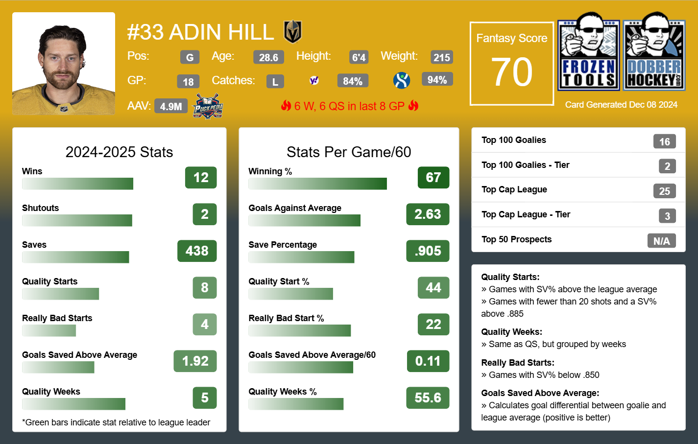 Seen as a Tier 2 goalie by Dobber before the season, I am not sure I would hold Hill with the same kind of confidence as Skinner or even Saros. That said, he’s been on an incredible streak, and he benefits from a strong Vegas team that is healthier than ever, especially with the return of Mark Stone.
