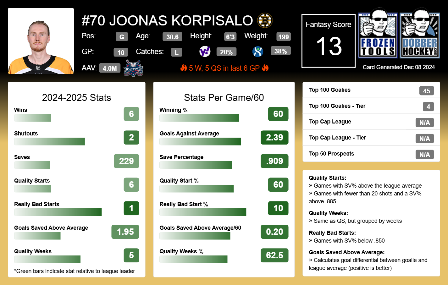 Jeremy Swayman is the primary goalie in Boston. As a result, Korpisalo has not gotten many starts, with only ten appearances this season. However, the Finnish goalie has produced some respectable value in fantasy for a pure backup, especially in deep league formats.