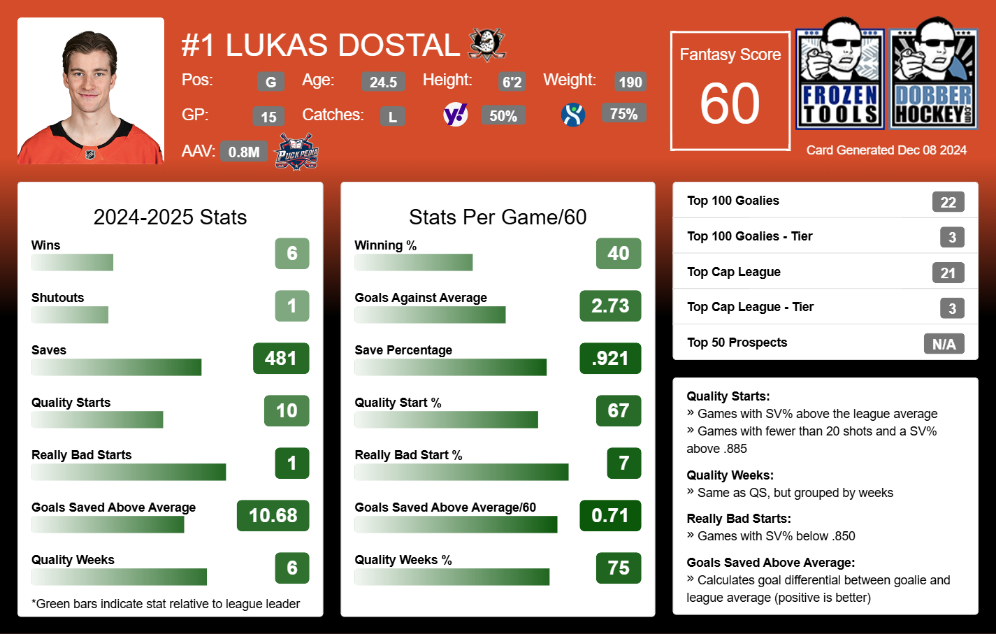 Dostal has been serviceable as a goaltender this season in Anaheim. In 15 appearances, he has six wins, a 2.73 GAA, a 0.921 SV%, a GSAA of 10.68, and 67% QS%. There haven’t been many goaltenders better than Dostal this season in terms of pure efficiency. It’s even more impressive when looking at how bad the Ducks team is (last in the Pacific with 23 points).