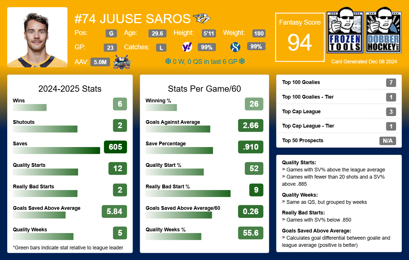 Saros will turn it around again in the other categories like GAA, SV%, and GSAA. However, unless something dramatic happens to this Predators team, he likely will underperform in wins, which is an unfortunate blemish on a fantastic fantasy goaltending season thus far.
