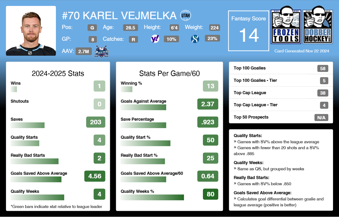 Utah plays back-to-back road games against Pittsburgh and Toronto on Saturday and Sunday, respectively. Thus, Vejmelka will get at least one start, and Goalie Post is projecting that he will get the start on Saturday against the Penguins (18 points), a more favorable matchup than the Maple Leafs (26 points).