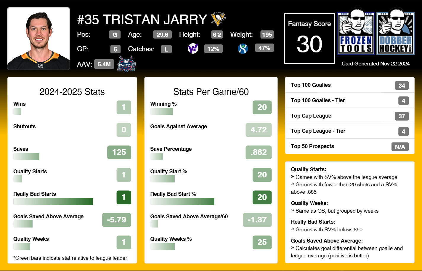 The 29-year-old goalie struggled in his first start back with the Penguins against the Blue Jackets on November 15th. He gave up five goals on 38 shots while producing a GAA of 5.12 and an SV% of 0.868 in the loss. His GSAA was -1.28, around his GSAA/60 mark for the season (-1.37) via Dobber.