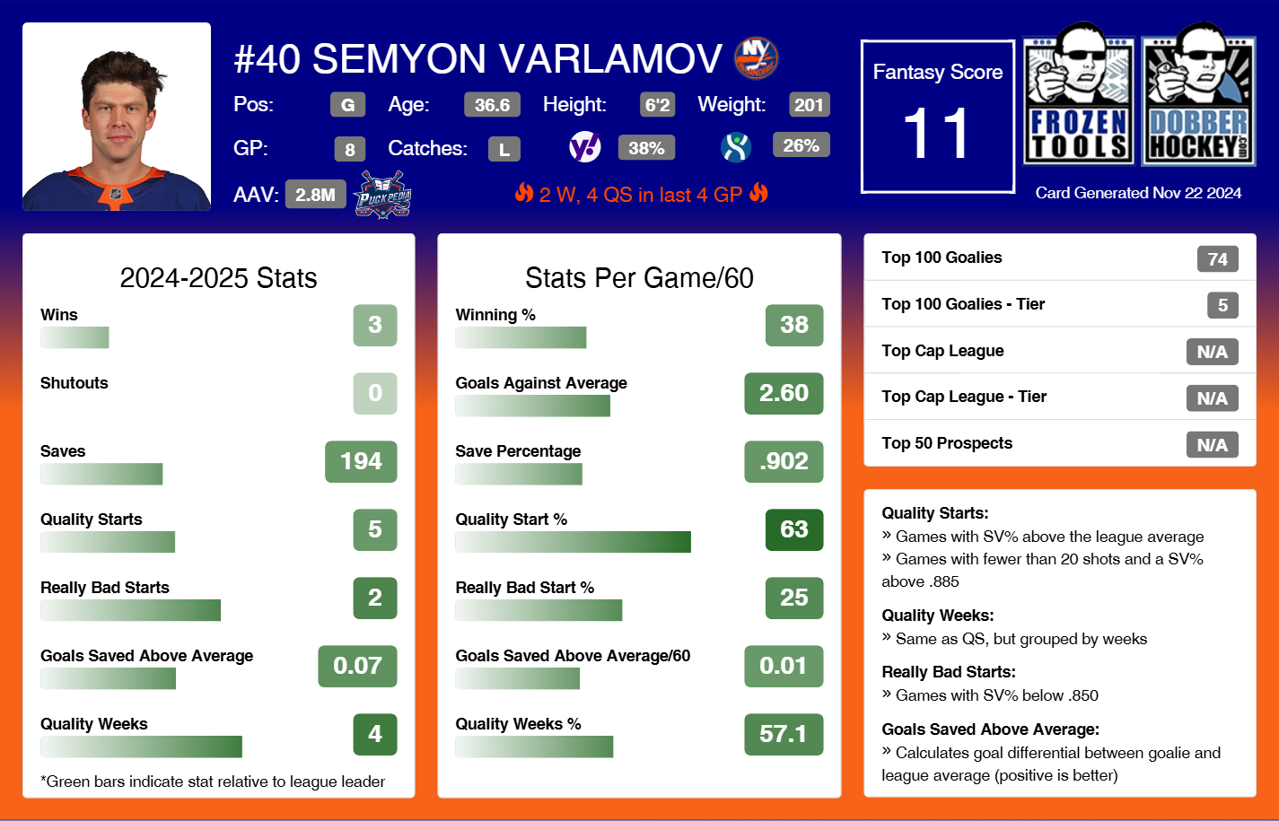 In 12 games, Ilya Sorokin is 4-5-3 but has 9 QS, a GAA of 2.64, and 0.914 SV%. Varlamov is the Goalie Two in Elmont, NY, but his numbers are just as comparable despite the 58% rostered difference.
